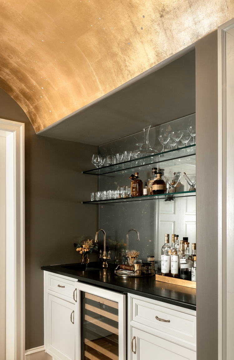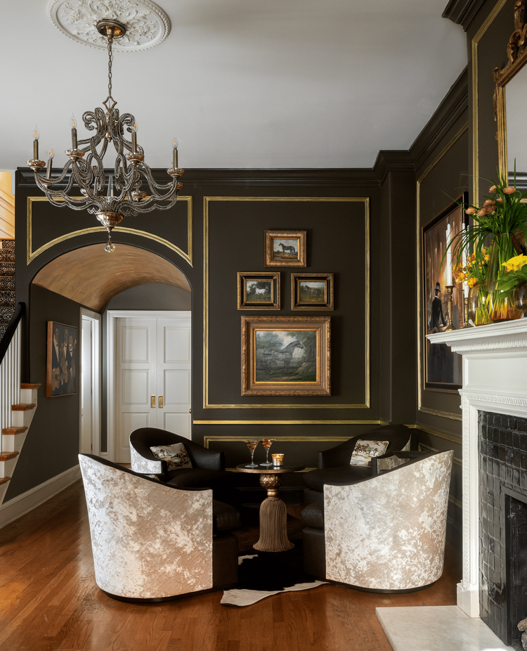 This entryway sets the tone with its stunning smoky marble and intricate ironwork details, creating a warm, welcoming vibe. We carried this elegance into the greeting and dancing room and the area bar. Our inspiration came from the timeless craftsmanship of Hermès horse saddles, paired with our clients' passion for horses and love for entertaining with their signature martinis. Every element in this space was thoughtfully curated to reflect our client's vision—blending comfort, elegance, and a touch of personal nostalgia. Heartfelt details like her mother’s candle collection bring warmth and history to the room, making it uniquely hers. She dreamed of having a space where she could unwind at the end of the day or enjoy quiet moments reading stories with her grandchildren. Our Inspiration for this serene and cozy corner came from a cherished photo our client shared—a beautiful chair with bright floral details that captured her heart.