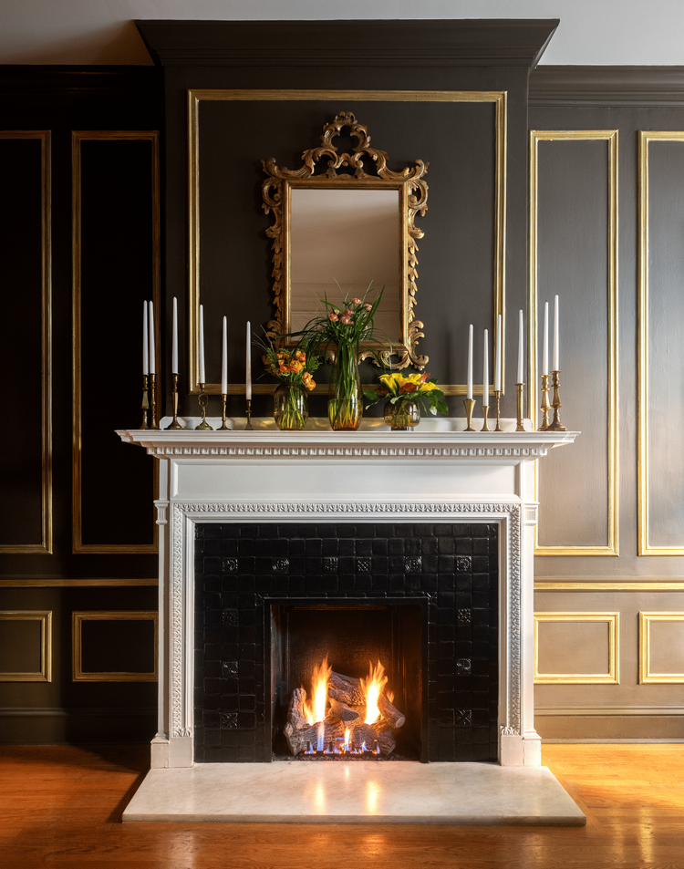 In the living room, we brought our client’s vision to life with stunning @degourney wallpaper panels, inspired by Parisian Gardens reminiscent of his French heritage, the cherished panels in his grandmother’s home. A vibrant purple sofa takes center stage and adds richness and personality, complementing a modern Monet-inspired area rug. Crystal Gold Leaf table lamps and a mix of new and refreshed furniture - including the client’s repainted side table-were carefully curated to complement the space and blend seamlessly into the design. Soft Lavender paint ties it all together creating a beautifully customized, personal, and timeless design the clients wanted. With their timeless charm, Fireplaces are often the heart of a room. For this project, we carefully restored its natural beauty and transformed it into a stunning focal point. Every element was thoughtfully curated to enhance its beauty, including the customized TV frame, which was designed to look like a piece of art.