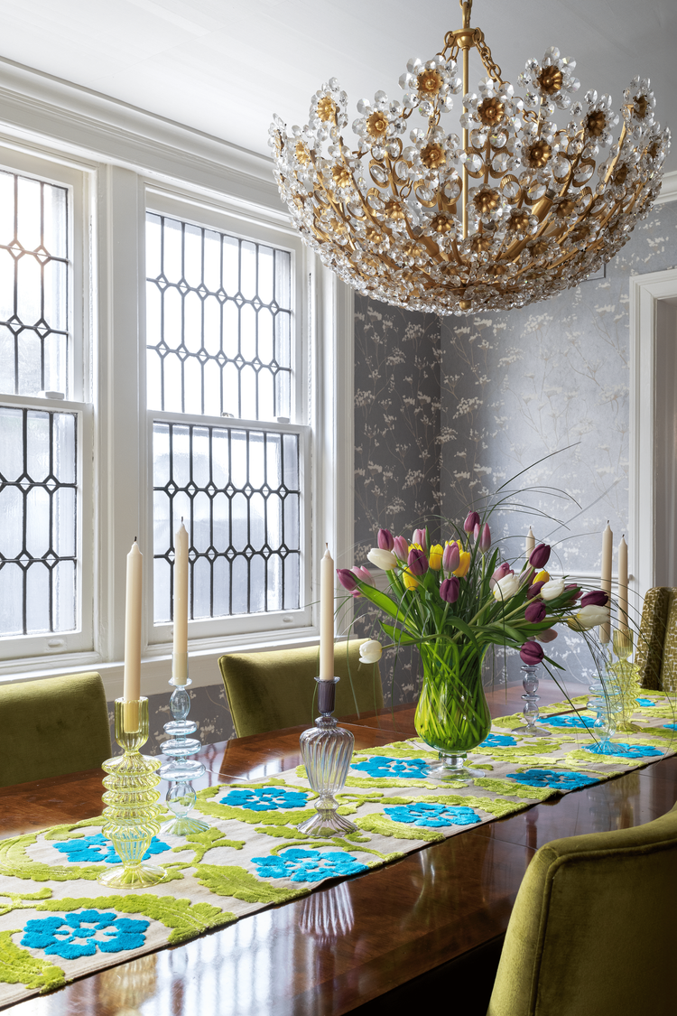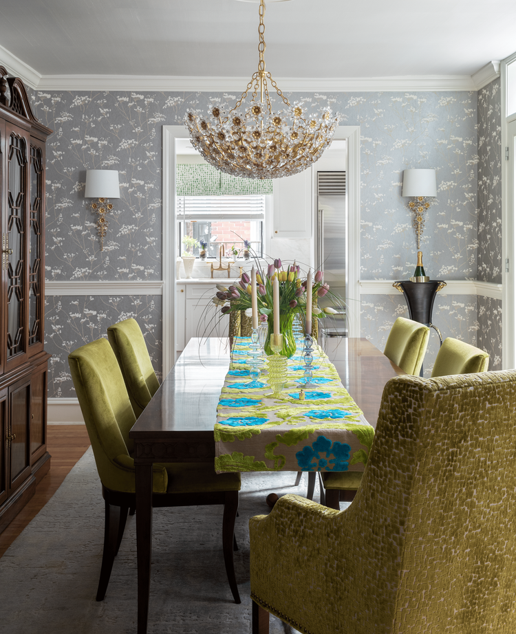 Parisian Dreams Brought to Life: This exquisite home design was inspired by our clients’ shared love for Paris. For this dining room, we drew inspiration from the serenity of springtime gardens and the home's original leaded glass details, reminiscent of Parisian museums, creating the perfect foundation for this elegant and cheerful design.